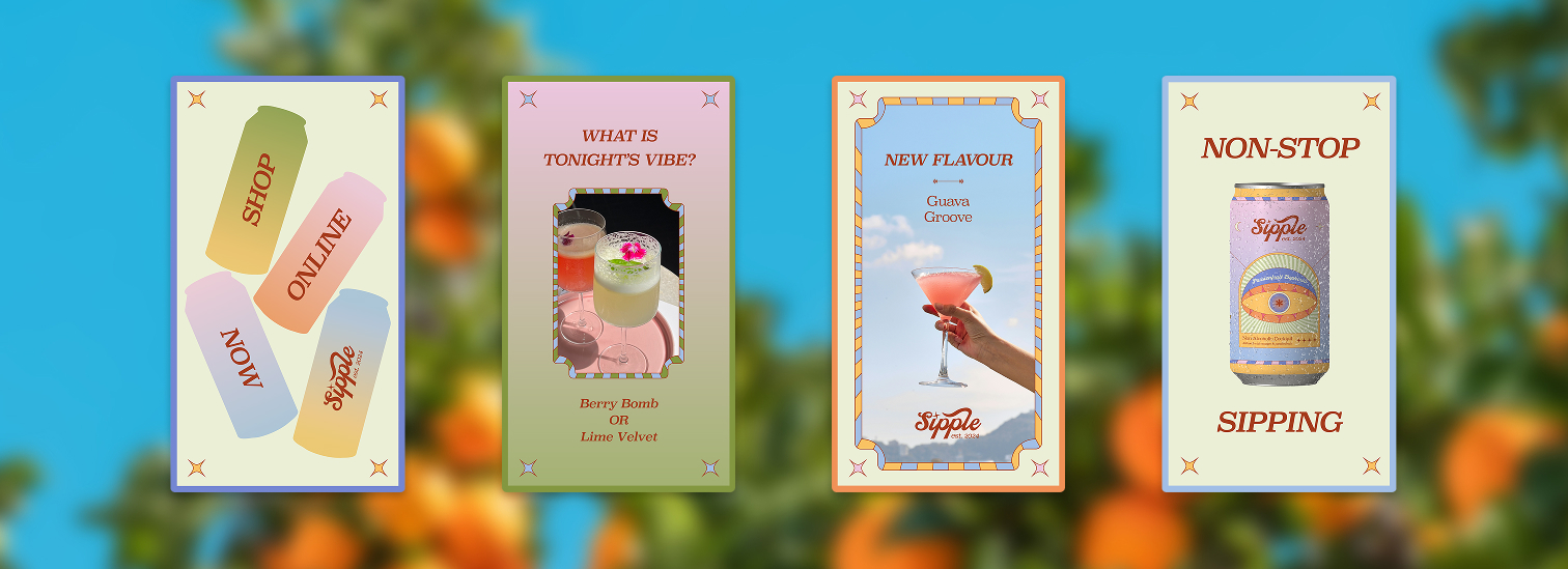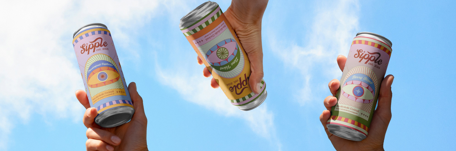 Sipple is a bold, alcohol-free cocktail made for the modern social scene. With more young people choosing non-alcoholic options, Sipple delivers a flavour-packed, affordable alternative to bland soft drinks and overpriced mocktails.Their brand needed to feel authentic, beautiful and timeless while speaking directly to their audience in a way that felt rich in flavour. The result is a vibrant, maximalist and celestial brand direction inspired by a younger social scene, helping Sipple stand out while staying true to its personality.